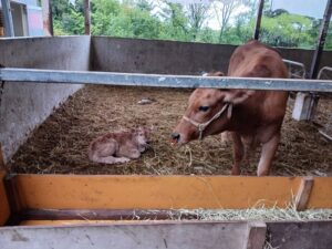 能勢農場の繁殖牛は今年4頭を出産しました。「あかうしの丘牧場」は5年前より、預託牛から産まれた牛を兵庫県の「能勢農場 春日牧場」に肥育牛として引き渡しています。「ゆめファーム」では産まれた牛を来年1月より引き取ることにしています。能勢農場がよつ葉のカタログで扱う牛肉素材として、能勢食肉センターに毎月2頭ずつ出荷を始めたのが2024年3月からで、その中には「あかうしの丘牧場」で産まれた牛や能勢農場で10年間飼養している繁殖牛2頭から産まれた牛も出荷されています。将来はすべての出荷牛をあかうしにしていこうと考えていますが、まだまだ先になります。
