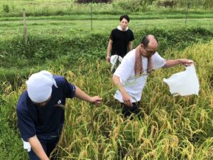 実家でもお米を作っているので経験済みですが、ヒエ抜きはほんと大変です。増してこの日は前夜に雨が降ったので田んぼはぬかるんで、稲をかき分けて進むとズボンが濡れました。それでも美味しいお米を食べてもらうために必死に作業しました。後から聞いた話では美味しいお米だったようで、手伝ったかいがありました。