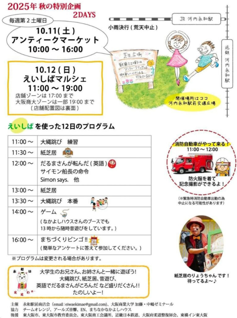 ★美味しい楽しいのマルシェ★大学生と大縄跳びやスポーツ★紙芝居★昔遊び★英語でだるまさんが転んだ★ゲーム★ビンゴ(16時〜)★消防車と記念撮影(11時〜12時)などなど、盛りだくさんでお待ちしています!!