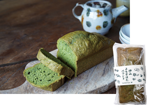 合言葉は「地産地食」。徳島の特産品のすだちをはじめ、小松菜やじゃがいも等さまざまな作物を有機JAS認証を取得し、自社で栽培。地域の農家が同様に栽培した作物と併せて、自社で運営する食堂やパン屋、加工品の製造に使っています。なかでも自社栽培したよもぎをふんだんに使用した「神山よもぎほたパウンド」は、もっちりとした食感と口いっぱいに広がる爽やかなよもぎの香りで大人気の商品です。