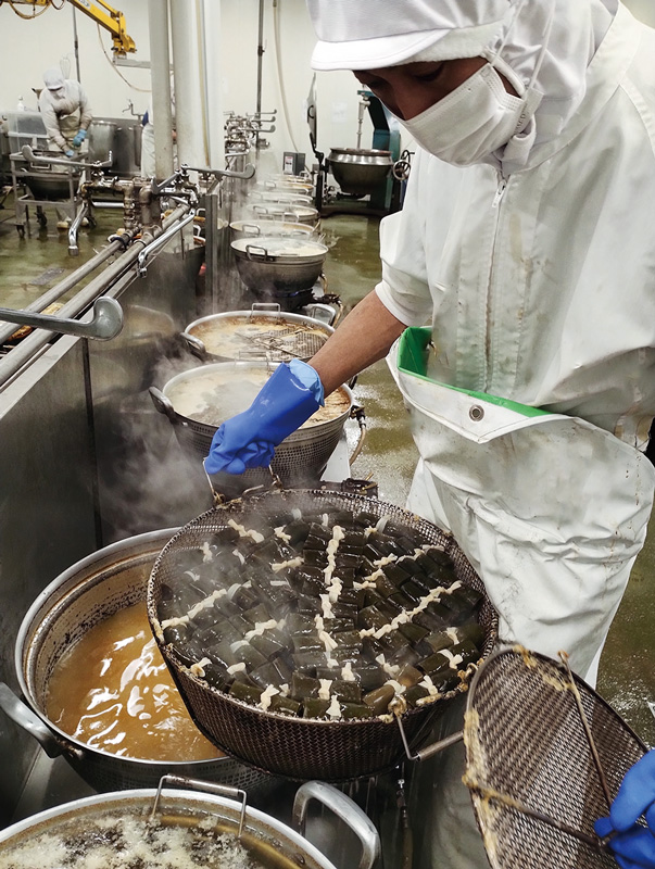 しかし味付けは教わらずに帰ってきました。工場であっても、砂糖、しょう油、みりんなど家庭にある調味料で仕上げた昔ながらの味を届けたい。との思いがあったからです。ひと釜ずつ直火炊きの手作りの調理方法で、素材の良さを引き出せるように、食材ごとにタレを使い分けています。タレは継ぎ足しながら味付けをしているので、旨みが凝縮しています。もちろん、食品添加物は一切使っていません。