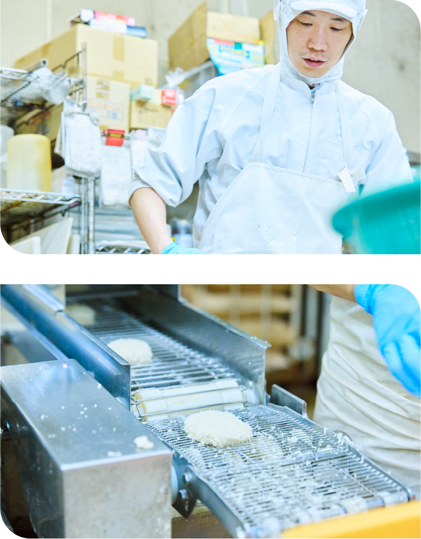 大北食品では、9人のスタッフで煮物や煮豆、コロッケ、グラタン、ドリア、唐揚げなど、冷蔵品から冷凍品までさまざまな惣菜を作っています。機械化は進みましたが、コロッケの成形など手作業による工程も多くあり、家庭料理のような手づくり感を大切にしています。