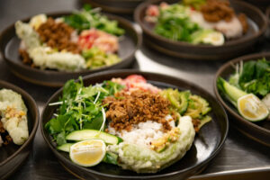 これらをミツバや貝割れ菜などの生野菜、虹色米を加えて炊いた新米と合わせて野菜たっぷりの一皿をつくることができました。新鮮な食材を届けていただいた生産者の方々、よつ葉スタッフの方々、ありがとうございました。