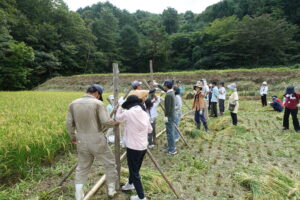 今回、初めて産地交流会、秋の稲刈り体験に参加させていただきました。初日は枝豆畑や味噌の貯蔵庫を見学し、生産者の方々と交流するなかで、普段口にする食材がどのように育てられ、どれほど丁寧に扱われているかを学びました。無農薬で身体に良いものを届けようとする工夫や熱意に触れ、真摯な姿勢に深く感銘を受けました。翌日は鎌を手に稲を刈り取り、農作業の厳しさと収穫の喜びを身をもって体験しました。