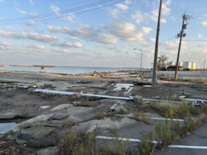 2024年の能登半島地震でも明らかである。原発の安全対策と避難計画には限界がある(写真右下参照)。道路が寸断されれば避難が不可能になり、家屋倒壊で「屋内退避」も機能しない。新潟は冬に北西の季節風が吹くため、事故が起きれば放射性物質が内陸側に流れ、福島事故以上の被害が出る可能性もある。